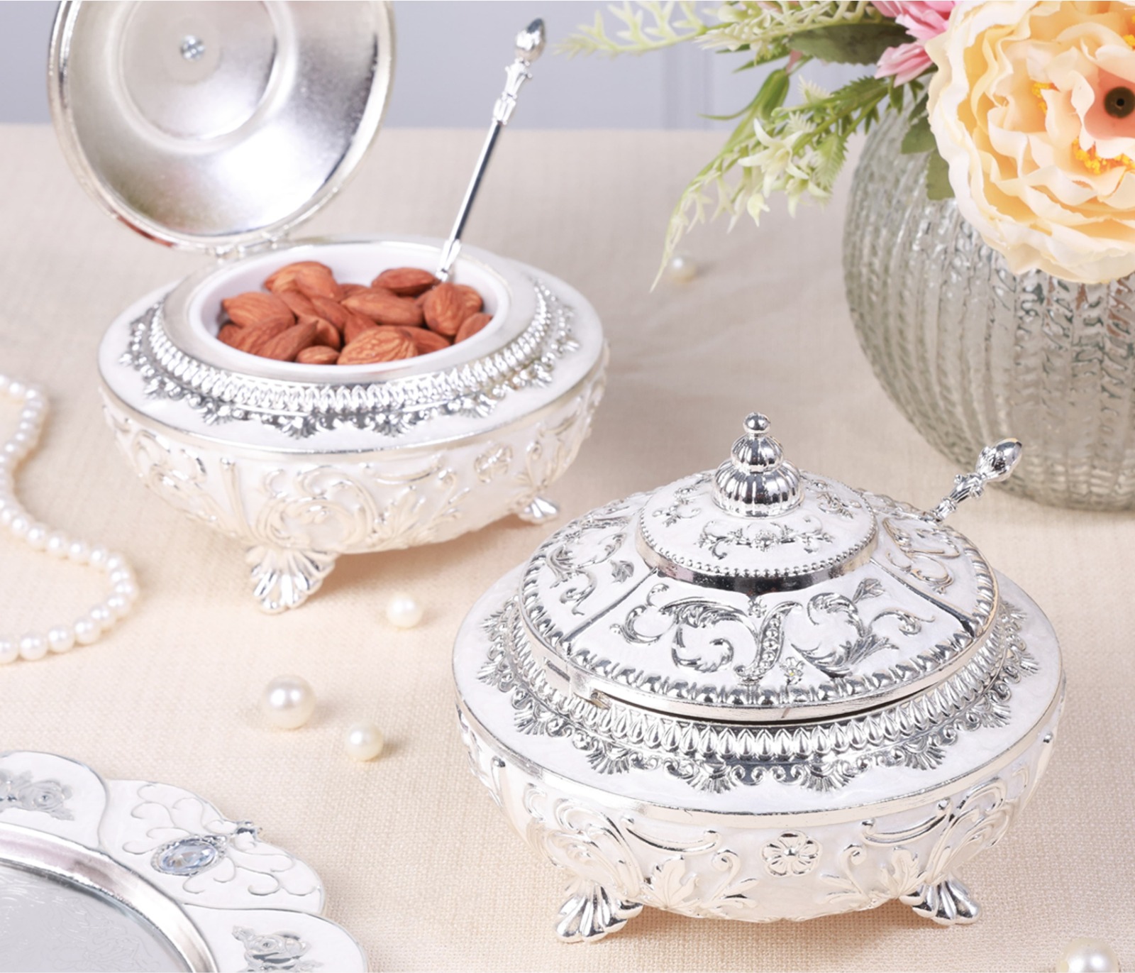 A beautifully crafted silver sugar pot designed to add charm and sophistication to your serving experience. With its smooth body and well-fitted lid, it is perfect for storing and serving sugar, mishri, or small treats. Its timeless design makes it a graceful addition to tea sets and dining décor.